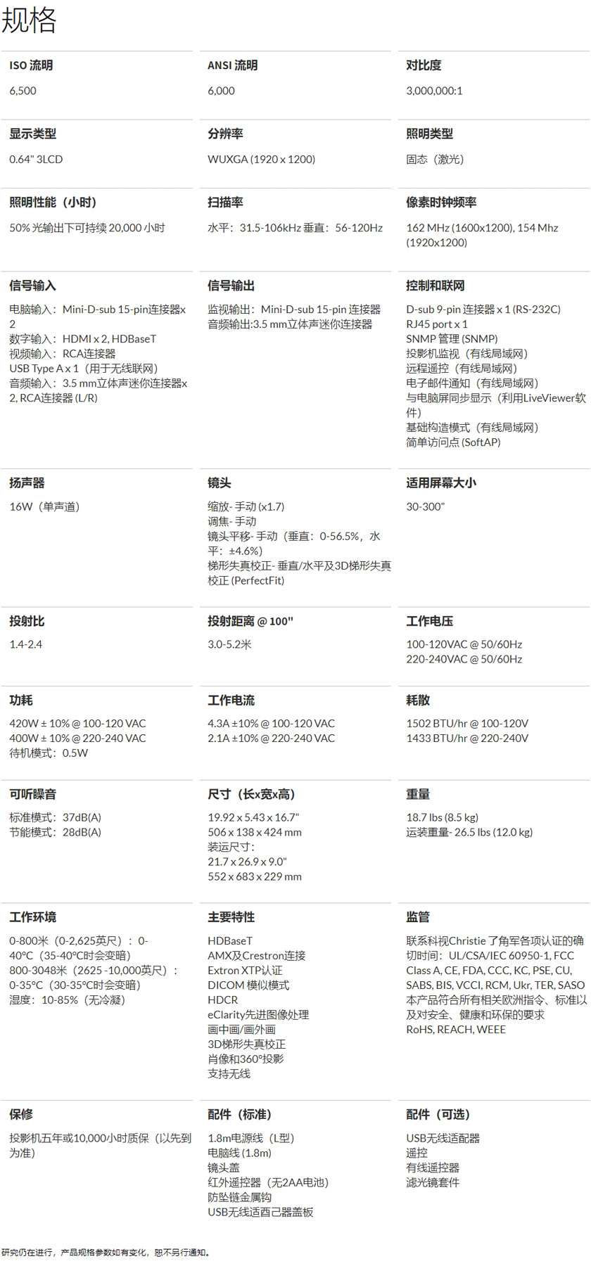 6,500 流明的科视Christie® LWU650-APS 采用经济实惠的 3LCD 技术与激光照明,确保投影仪的可靠性、性能和使用寿命。LWU650-APS 注重品质和价值,适用于教室、董事会议室和会议室等。